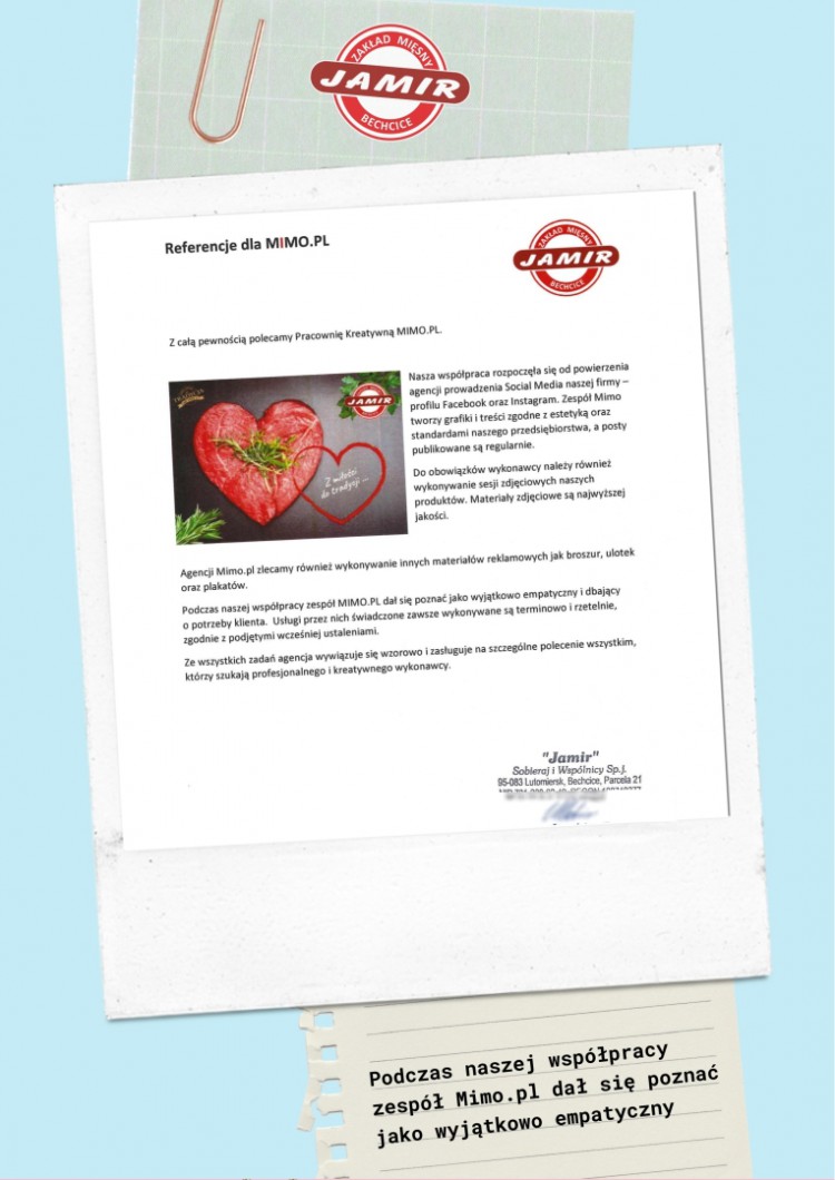 Miło nam poinformować, że otrzymaliśmy list rekomendacyjny od firmy Jamir, którą obsługujemy w zakresie social media a także projektów graficznych DTP i fotografii reklamowej.